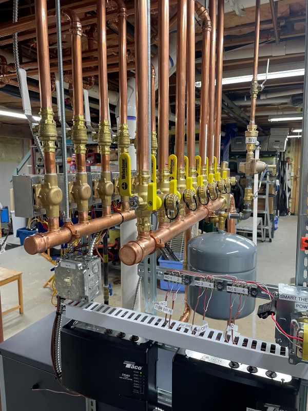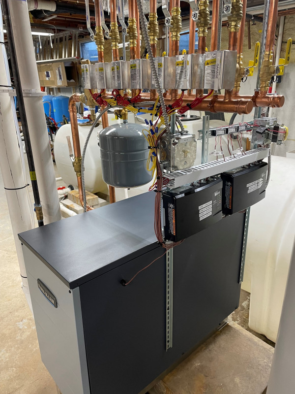 The guys replaced an old oil fired System 2000 boiler with a new Weil Mclain GV90-5 propane boiler. New supply and return headers were built and new zone valves installed.