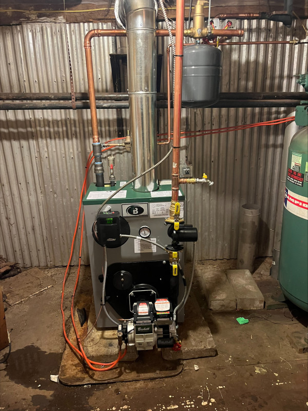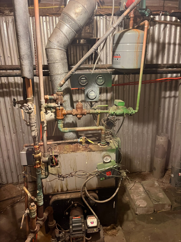On this installation we replaced this relic with a Peerless WBV-03 cast iron boiler with Beckett burner. New manifolds/headers, new exhaust, new zone valves and circulator, new feed valve with back flow and expansion tank, new ball valves for serviceability.